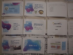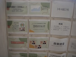 3年生が社会科の授業で、地方自治仕組みと役割について学習する中で取り組んできた、「深谷市の政策を多面的・多角的に考察し、深谷市に政策提言しよう」の全グループのまとめが、3年生の廊下に掲示されています。