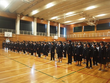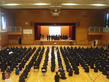 校歌の指揮者の引継ぎも行われ、新しい生徒指揮者のもと校歌斉唱をした後、新本部役員の自己紹介と活動方針の発表、校長の話がありました。