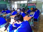 MEXCBTを用いたオンライン形式で行われ、生徒はヘッドセットを付け、一人一台貸与されているタブレット端末を使って回答しました。明日は国語と数学の調査を行います。