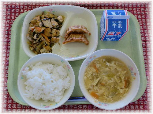 牛乳 ご飯 生揚げと豚肉のキムチ炒め 揚げシュウマイ サンラータン