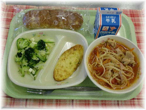 牛乳 パインパン スープスパゲティ オムレツ グリーンサラダ