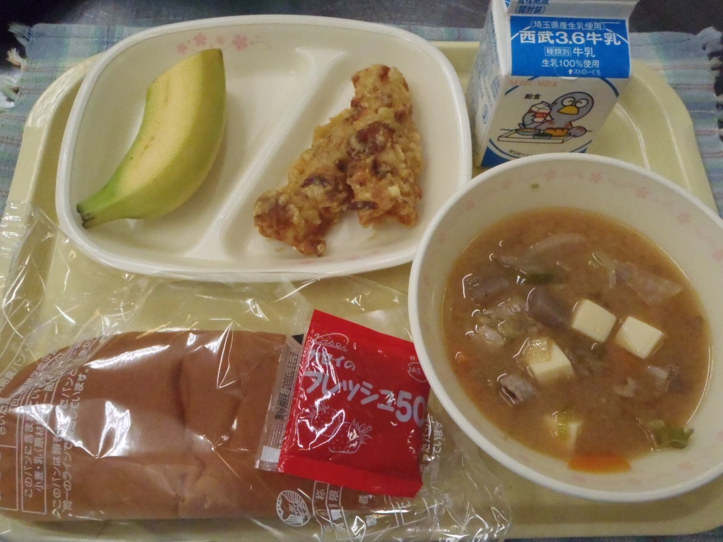 きょうは「防災の日」にちなんだ献立です。炊き出しをイメージした豚汁やちくわの天ぷら、手軽に食べられて空腹を満たせるバナナなどの給食です。いざという時に備えて飲料水や缶詰などを用意したり入れ替えておくことをおすすめします。