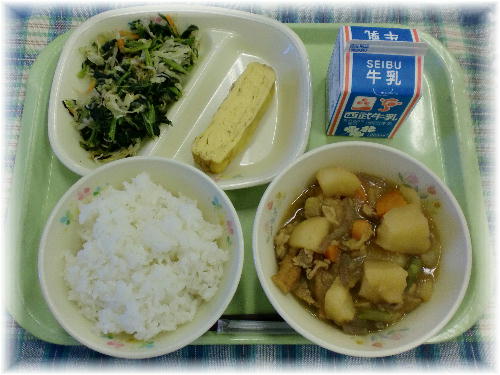 牛乳 ご飯 肉じゃが 厚焼き卵 磯の香和え じゃがいもはビタミンCが豊富に含まれています。熱に弱いビタミンCですが、じゃがいものビタミンCは澱粉でガードされているので、壊れにくいという特徴があります。じゃがいもは「カリウムの王様」といわれるくらい、カリウムがたくさん含まれています。カリウムは体の中のナトリウムを排泄し、血圧を下げる働きをするので、高血圧予防や腎臓の機能が低下している時にも効果があります。 肉じゃがは生徒の大好きなメニューです。残りもなく、しっかり食べていました。