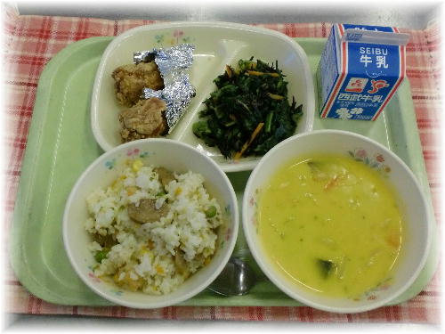 牛乳 エビピラフ フライドチキン パンプキンポタージュ ほうれん草サラダ