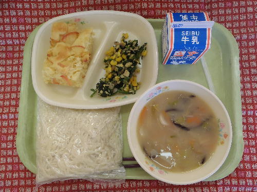 長崎県長崎市発祥のちゃんぽんは、長崎県の郷土料理です。明治時代中期、長崎市に現存する中華料理店「四海樓」の初代店主陳平順が、当時日本に訪れていた大勢の中国人(当時は清国人)留学生に、安くて栄養価の高い食事を食べさせる為に考案したとされています。肉、魚介類、野菜など十数種の具材をラードで炒め、豚骨と鶏がらでとったスープで味を調えます。そこにちゃんぽん用の麺を入れて煮立てます。これが他の中華麺類との大きな違いです。太い麺と具材の多さが特徴です。給食では麺を入れて煮立てることはできませんが、ちゃんぽんスープを味わって食べました。