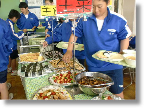 ◎中学校で初めてのバイキング給食で、とてもおいしかったです。小学校の時はエネルギーやカルシウムなどをあまり考えないで食べていましたが、中学になると、栄養や体のことを考えて食べたので、いつもより、おいしく感じました。基準までエネルギーが届かなかったので、次回は基準を超えたいです。