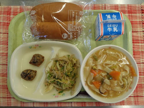 牛乳 黒パン 煮ぼうとう つくね ヘルシーサラダ エネルギー:777kcal たんぱく質:28.1g 煮ぼうとうは深谷市の郷土料理です。煮ぼうとうは郷土の偉人、渋沢栄一翁が好んで食べたといわれ、故郷に帰った時には必ず食べていたそうです。上柴中学校の生徒たちも煮ぼうとうが大好きで、残りもほとんどなく、よく食べていました。