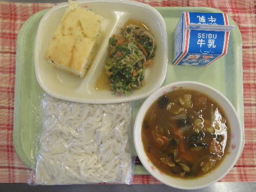 牛乳 カレーうどん カルシウムパンケーキ ごま和え エネルギー:892kcal たんぱく質:29.6g 今日のごま和えの小松菜は、7.8組の生徒が金工室前の花壇で、一生懸命育てた小松菜です。今日の給食のために、昨日、三時間もかけて収穫しました。新鮮なしかも無農薬の上柴中学校産の小松菜です。 小松菜は緑黄色野菜のなかでもカルシウム含有量が多く、常食するとストレスを解消し骨粗鬆症を防ぎます。