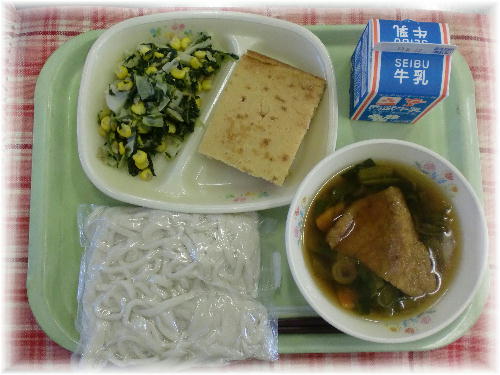 きつねうどんの「きつね」の名称は稲荷寿司と同様、油揚げがキツネの好物とされていることに由来します。一説には油揚げの色・形がキツネがうずくまる姿に似ているからだともいわれています。また、『芦屋道満大内鑑』(人形浄瑠璃)に描かれた泉州の信太の森の葛の葉狐にちなんで「しのだ」と呼ばれることもあります。「きつね」と「しのだ」を両方出す店舗では、「きつね」は油揚げを1枚、「しのだ」は油揚げを2枚乗せて提供される場合が多いそうです。名古屋では店にもよりますが刻んだアゲが入った物を「しのだ」、刻んでない煮アゲが入ってる物を「きつね」と言うそうです。京都の方言では、「けつね」とも発音します。伝統的には、味付けをしていない(もしくはほとんど味付けをしていない)刻んだ油揚げを具としたものを指すことが多いです。今日は油揚げが1人1/2枚つきましたが、残りが1枚もありませんでした。
