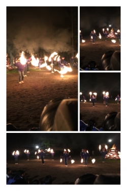 様々なチームが余興を披露し、最後はダンスとトワリングです。炎が灯ったトーチを振り回してダンスをしてくれました。残念ながら最後は大雨になってしまいましたが、楽しめたようです。今日一日の疲れを癒して明日のハイキングに備えます。