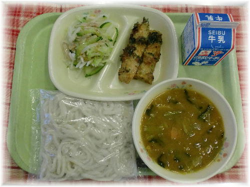 牛乳 カレーうどん 竹輪の石垣揚げ ハムと大根のサラダ