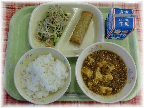 牛乳 ご飯 四川風麻婆豆腐 春巻き もやしのナムル
