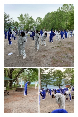 寒いバンガローで寝ていたので体ががちがちです。ラジオ体操で全身をほぐしてハイキングに備えます。