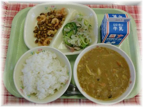 牛乳 森のきのこ手作りカレー 大豆のカリカリ揚げ ハムと大根のサラダ