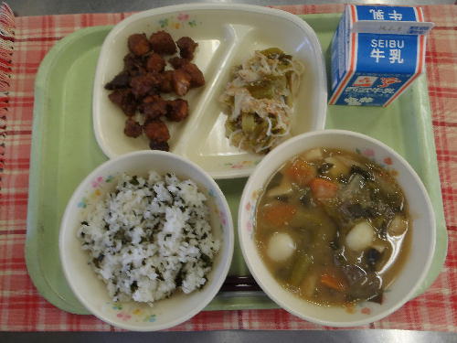 牛乳 わかめごはん 豚肉とレバーのごまだれ ねぎぬた 重忠汁 エネルギー:852kcal たんぱく質:31.8g