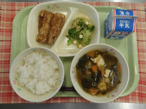 牛乳 ご飯 サンマのかば焼 ブロッコリーサラダ 味噌汁