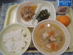 きょうは1年4組の生徒さんが考えてくれた献立を給食で紹介しました。冬の献立で鮭やみかん、しょうがなどこの時期に食べたい食材がたくさん入った献立です。栄養のバランスが良く彩りも考えられた献立です。