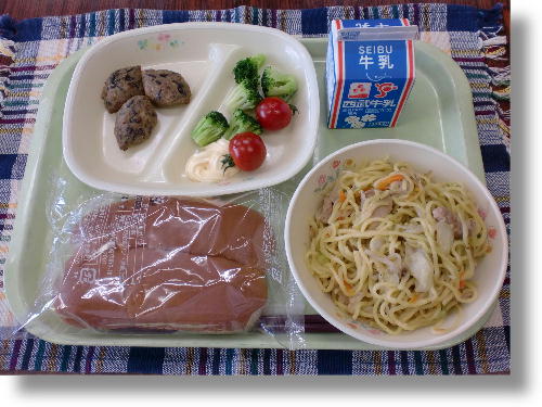 牛乳 黒パン 塩焼きそば 肉団子 温野菜 ミニトマト