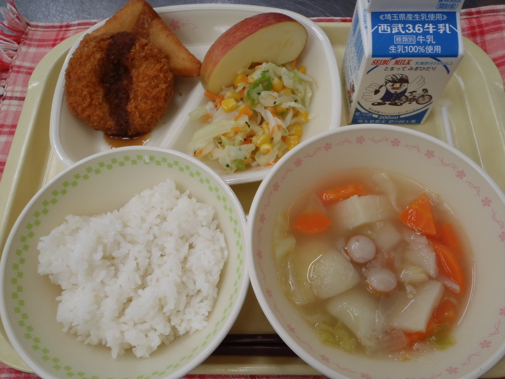 ご飯の献立で洋風にまとめています。また、野菜をたくさん使って色合いのきれいな献立です。栄養のバランスもよく、1から6群の食品がそろっています。長野県産の蜜がいっぱい時入った美味しいリンゴが届きました。