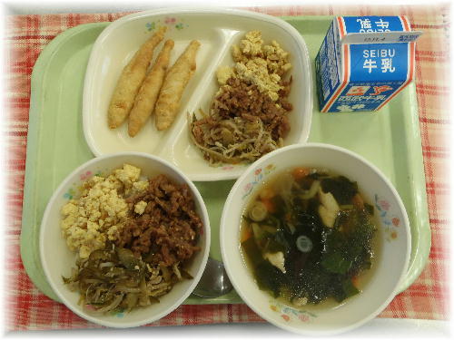 牛乳 ビビンバ わかさぎ天ぷら 春雨スープ