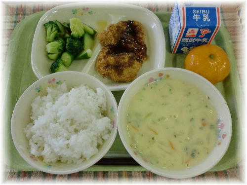 牛乳 ご飯 とんかつ コーンスープ 温野菜 冷凍みかん 今日は1年1組のリクエスト給食です。普段はとんかつではなく、チキンカツですが、今日はリクエスト通りにとんかつにしました。 豚肉は日本人が一番よく食べている肉でその消費量は牛肉の約3倍になります。 豚肉に含まれる栄養素の中で注目したいのは、なんといっても豊富なビタミンB1です。この栄養素は牛肉や鶏肉の5~10倍も多いという特徴があります。この栄養素は「疲労回復」に効果的です。