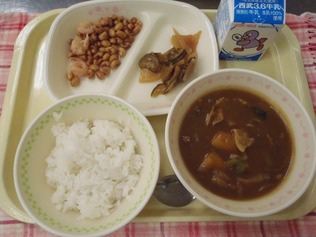 夏野菜のカレーライスは、いつものカレーの玉ねぎ、じゃがいも、にんじんに加えて、なす、かぼちゃ、ピーマンなどの夏野菜がたくさん入ったカレーです。野菜がゴロゴロ入っていますが残さずきれいに食べていただきました。