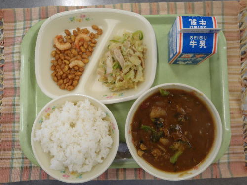牛乳 冬野菜のカレーライス 大豆のカリカリ揚げ ハムと大根のサラダ エネルギー:892kcal たんぱく質:30.9g