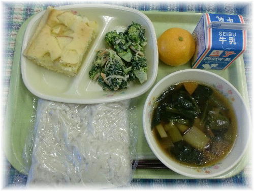今が旬のリンゴを使ったパンケーキです。 リンゴにはペクチンという食物繊維が豊富に含まれています。ペクチンは水に溶けるとゼリー状に固まるため、便秘の時には便を柔らかくして排便を促し、下痢の時には腸壁を守ります。 アップルパンケーキは、生徒にも人気のメニューで、残りもほとんど無く、とてもよく食べてくれました。