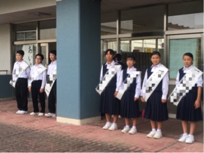 生徒会選挙に出る候補者のみなさんが挨拶運動をしています。大きく名前が入ったタスキをかけて顔と名前を覚えてもらいます。