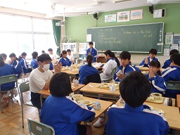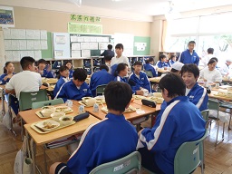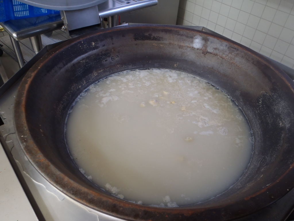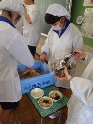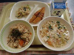 きょうは、年に一度の「たけのこご飯」です。たけのこをあくぬきして、ゆでてご飯の具に入れます。この時期しか味わえない、たけのこの風味と食感を味わっていただきました。