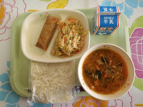 牛乳 キムチ入りごま味噌ラーメン 春巻き 中華サラダ エネルギー:935kcal タンパク質:31.1g