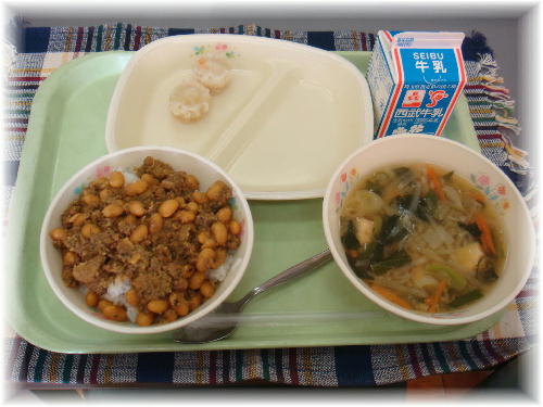 牛乳 ソイ丼 蒸し焼売 味噌汁