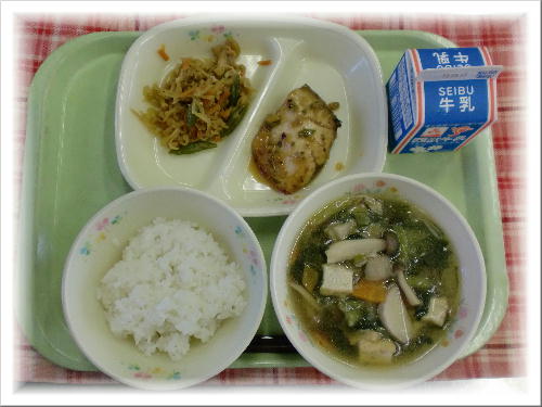 牛乳 ご飯 鯖ねぎ味噌焼き 切り干し大根の炒り煮 いもの子汁