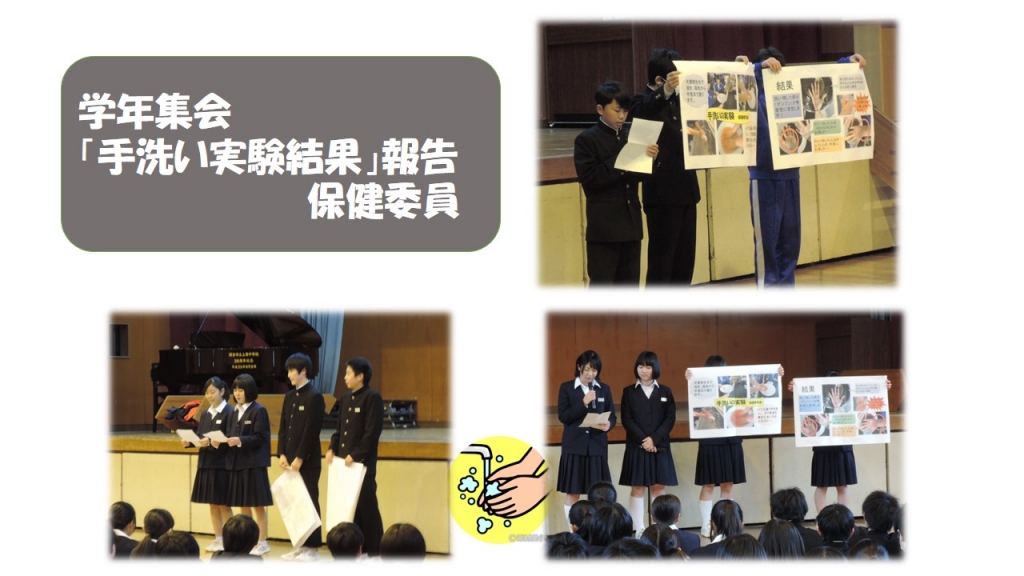 各学年集会で、保健委員が「手洗いの実験結果」について報告しました。