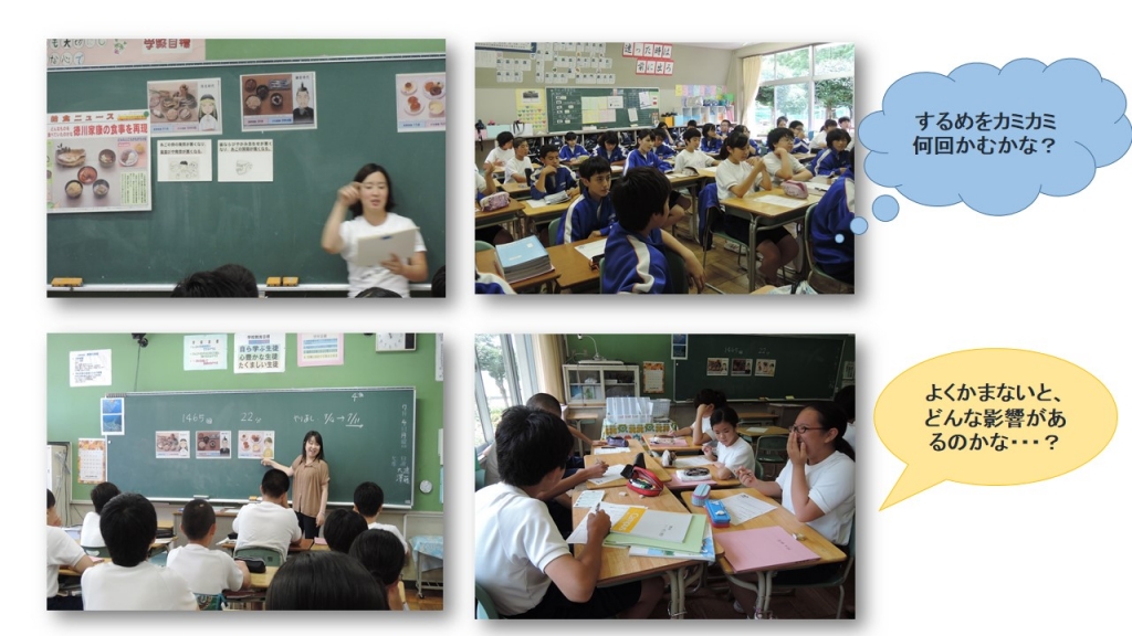 2年生は「かむこと」について勉強しました。昔と現代の食事を比較した後、するめを何回でかみ終わるか体験し、グループで「よくかまないと身体にどんな影響があるか?」を考えました。今後の食事の目標として、「一口30回以上かむ。」、「左右の歯で均等にかむ。」、「早食いしない。」などが出ました。