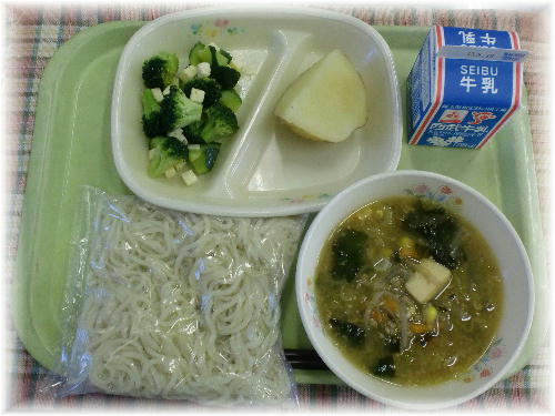 今日の給食のどさんこラーメンは、味噌味のスープに、いかやわかめ、コーンなどを入れて、最後にバターで香り付けをしてみました。いつもの味噌ラーメンよりも、残りが少なく、とてもよく食べてくれました。
