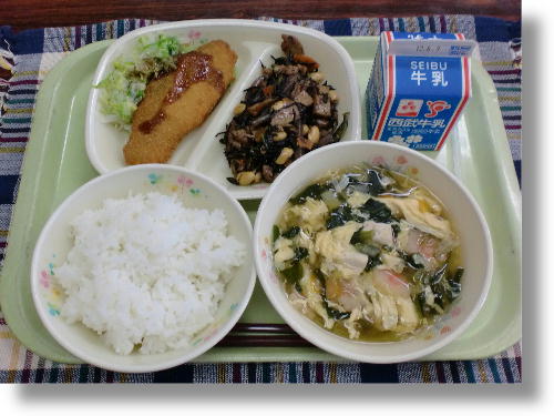牛乳 ごはん 鮭チーズフライ ゆできゃべつ 大豆の磯煮