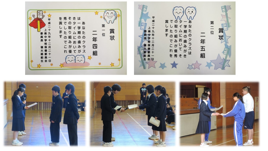 各学年、歯みがき調べの結果上位2クラスを表彰しました。