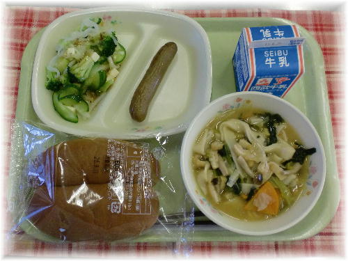 牛乳 黒パン 煮ぼうとう ウインナーソティ グリーンサラダ