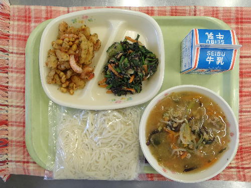 大豆とポテトの揚げ煮 ほうれん草のサラダ エネルギー:822kcal たんぱく質:34.2g 今日は大人気のごま味噌ラーメンです。ごま味噌ラーメンにはごまがたっぷり入っています。昔からゴマは漢方薬としても用いられてきました。種皮の色によって黒ゴマ、白ゴマ、金ゴマに分けられますが、栄養的にはほとんど差はありません。黒ゴマの皮の部分にはタンニン系ポリフェノール色素が多く含まれています。
