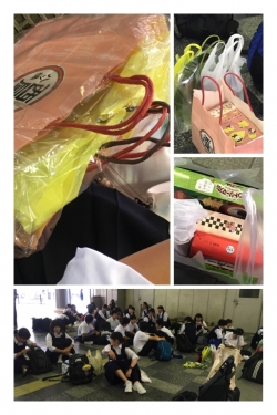 クラスごとに集まっています。今朝送った荷物にもお土産がたくさん入っているはずですが、また両手にいっぱいのお土産が追加されています。