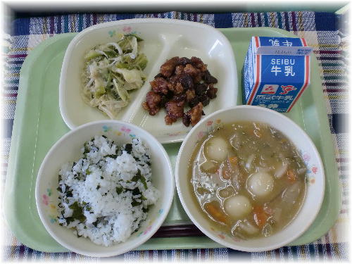 牛乳 わかめご飯 豚肉の香味揚げ 重忠汁 ねぎぬた