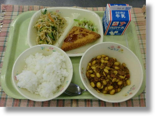 ソイ丼は、みなさんが比較的好まない食材の大豆を豊富に使ったメニューで、成長期に必要なカルシウムや鉄分も豊富に摂取出来ます。ご飯にかけて食べてください。ご飯と大豆を組み合わせることにより、より高い栄養効果が期待できます。 畑の肉と呼ばれる大豆は良質のたんぱく質や、ビタミンB群が多く含まれています。動脈硬化や肥満をコントロールし、コレステロールを低下させる作用があるので、高脂血症予防にも期待できます。
