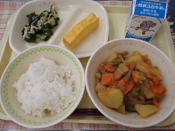 新じゃがが出回っておいしい季節になりました。きょうはカレー風味の味付けです。生徒の皆さんにおいしく食べていただけるよう調理員さんが上手に煮て仕上げました。
