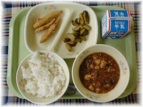 牛乳 ご飯 麻婆ナス豆腐 ワカサギフリッター 中華きゅうり エネルギー:831kcal たんぱく質:30.3g 今日の麻婆豆腐にはナスが入っています。ナスの原産地はインドです。日本へは奈良時代に中国からもたらされました。 ナスの鮮やかな紫色はナスニンという色素によるものです。ナスは比較的嫌いな生徒が多い野菜ですが、今日は食べやすいように、一度揚げてから麻婆豆腐に入れてあります。生徒達はよく食べてくれました。