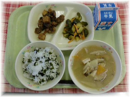 牛乳 わかめご飯 豚肉のごまだれ和え