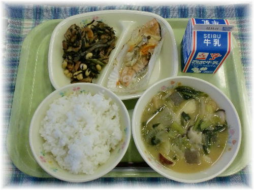 牛乳 ご飯 鮭の塩麹焼き 大豆の磯煮 彩の国すいとん