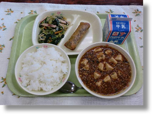 牛乳 ご飯 麻婆豆腐 ひじき入り春巻き 深谷ねぎのナムル