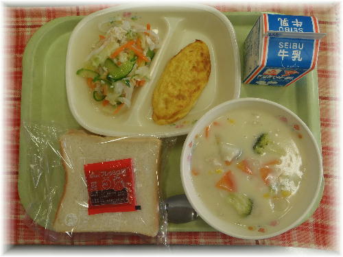 牛乳 食パン いちごジャム オムレツ クリームシチュー 大根ときゅうりの和え物