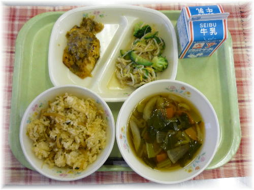 エネルギー:762kcal たんぱく質30.3g キムタクご飯 は、平成23年2月10日に放送された読売テレビ秘密のケンミンSHOWで紹介された献立で、塩尻市に住む長野県の小学生に人気だという給食メニューです。キムチ や たくあん が入った混ぜごはんだから キムタクご飯 というそうです。上柴中学校でも2年前から給食で出していますが、大変人気の高い献立です。